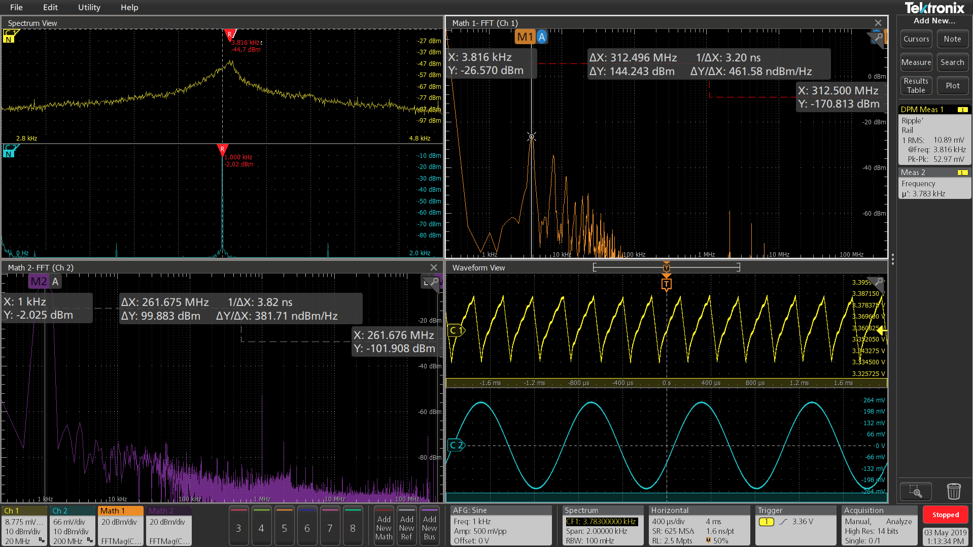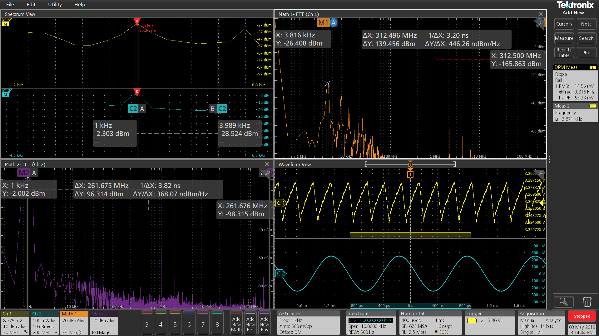 Once the signals are connected, let us enable both traditional FFT analysis using waveform math and enable Spectrum View on the same two channels. This provides us with a scope display as shown in Figure 2. Note that the 3.3V DC signal amplitude on Channel 1 varies between 3.33V and 3.38V and exhibits a ripple frequency of 3.871 kHz. This can be measured using the scope frequency measurement. Alternately, if you have multiple DC rails, you can leverage the optional 5-DPM solution which computes the RMS, frequency and peak to peak value of the ripple on up to seven DC rails on the eight channel 5 Series MSO simultaneously. This measurement is shown as the “Meas 1” badge in Figure 2.