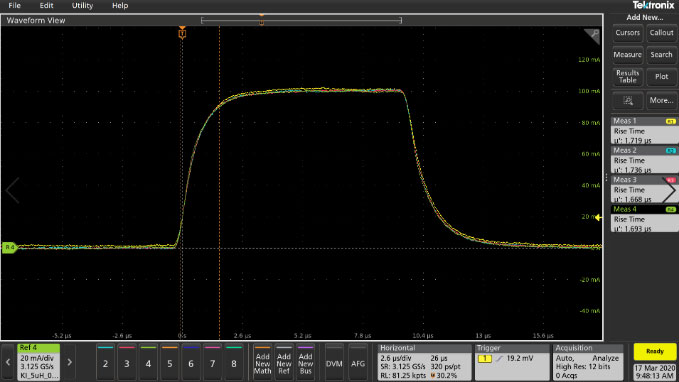 这种新型仪器最具创新性的功能是不要求手动调谐,不管电流幅度是多少,也不管电感负载高达3 μH。在输出电流脉冲时,线缆和电感可能会成为难题。电感可能会有限制效应,甚至会带来损坏。电感在不同器件之间通常是不同的,即使是在测试晶圆上的激光二极管时。电感对电流源的影响在于,电感会阻止电流变化。这会导致电流源提高输出电压,在脉冲稳定时导致过冲和振铃,而这在测试中是不可接受的。