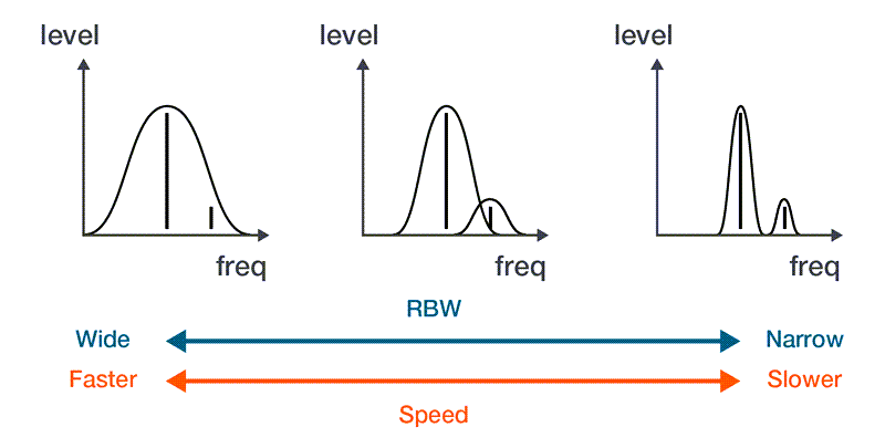 Figure 1. Looking at two signals of different power levels, a wide RBW means a faster measurement, but small signals can be obscured near large signals or under the higher noise floor.