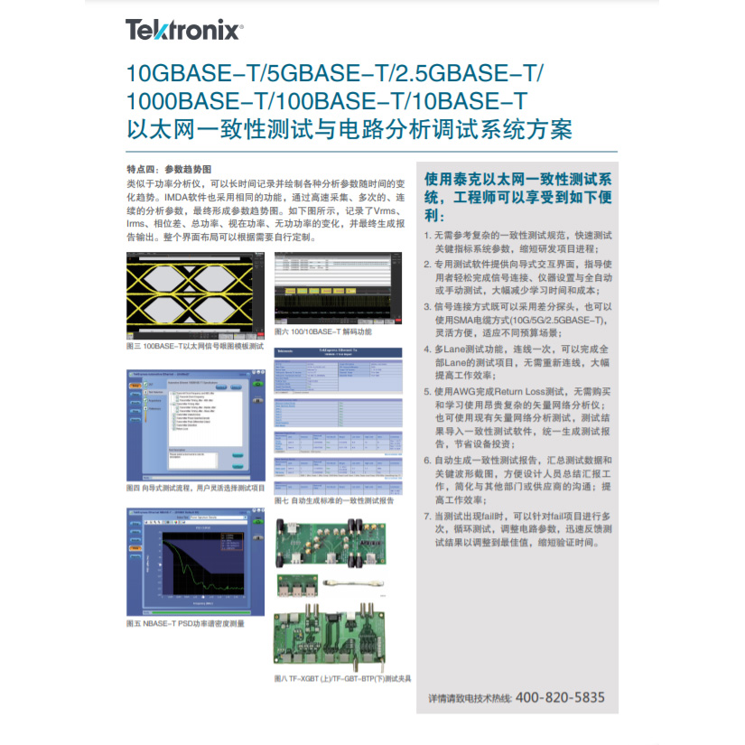 泰克公司为解决以太网一致性测试中的难题,为贵公司推荐配置了基于MSO64示波器的10G/5G/2.5GBASE-T和1000/100/10BASE-T一致性测试及分析调试系统。