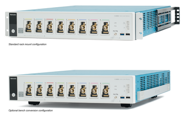 5 系列 MSO 紧凑型在节省空间的 2U 高的封装中,提供了 8 个 FlexChannel 输入外加一个辅助触发输入,以放入 19 英寸宽的机架中。仪器有侧面通风孔,因此仪器可以装在机架中,彼此叠加,从而省出更多空间。