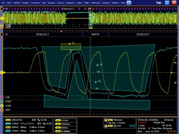 混合信号示波器可以在内存总线和触发器上探测更多信号和查看特定总线事件。通过泰克 MSO5000 或 MSO70000 系列示波器,可以使用多达 16 条数字通道来查看命令和地址信号的逻辑状态,如 RAS、CAS、WE、CE 或 CS。