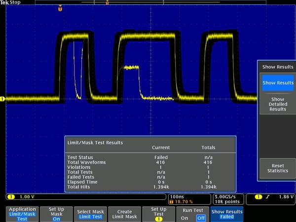 极限测试显示从黄金波形创建的模板并与活跃信号进行比较。结果中将显示出有关测试的统计信息。
