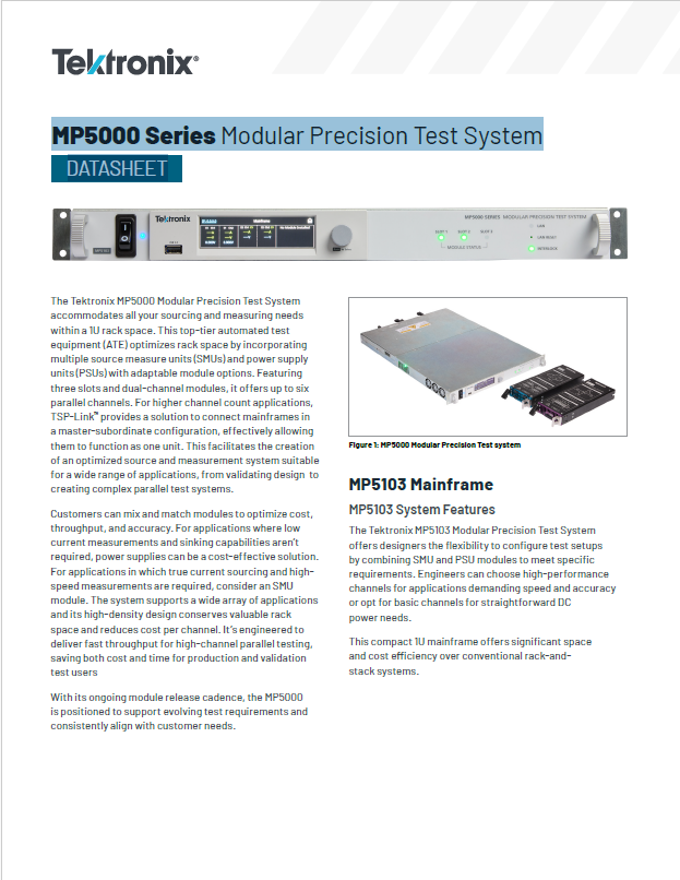 Datasheet for the Tektronix MP5000 Modular Precision Test System that accommodates all your sourcing and measuring needs within a 1U rack space.