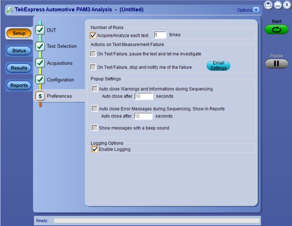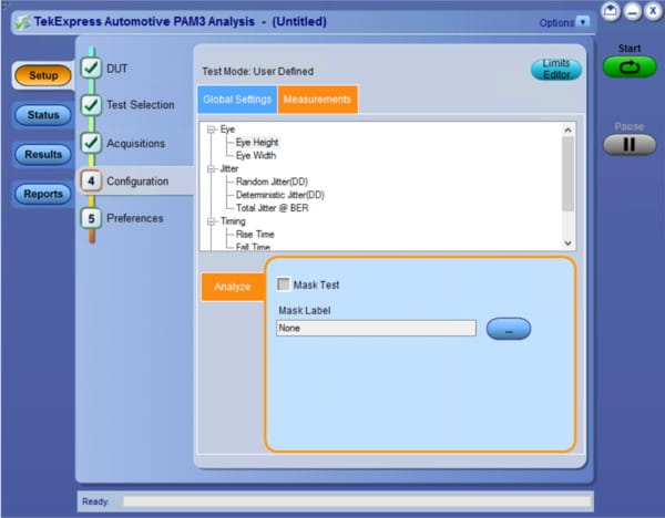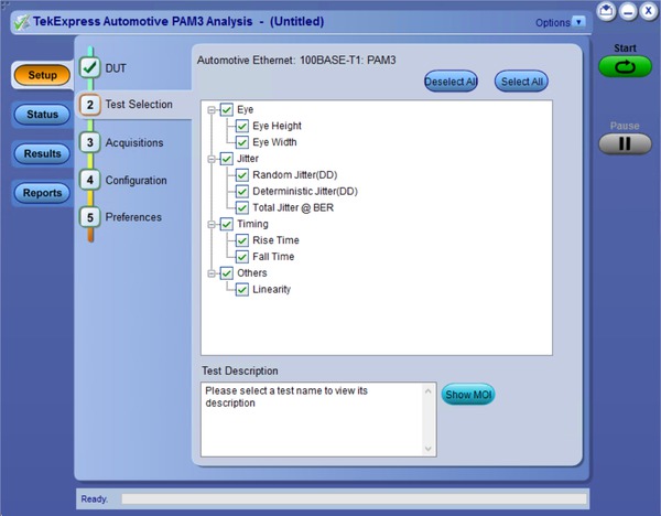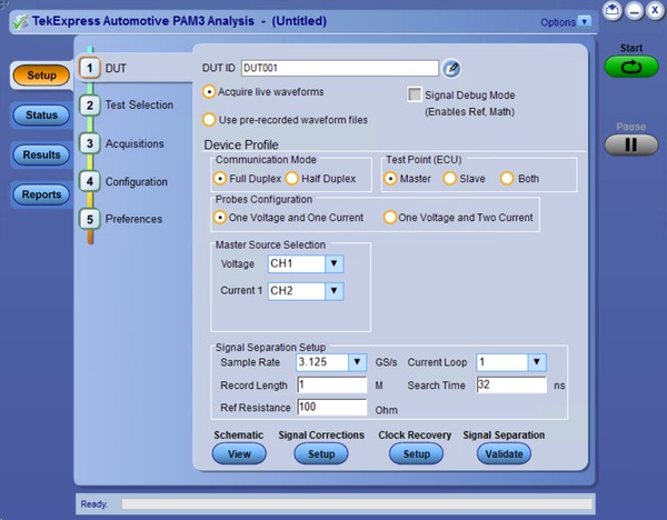 自动化:TekExpress 以太网信号分离和 PAM3 分析软件是一种全自动测试解决方案。在使用 泰克 TekExpress 自动化平台时,其用户界面会一步步引导您配置系统,执行分析。