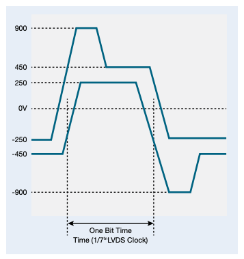 LVDS signals use differential voltage swing on inverting and non-inverting lines in opposite directions, riding on a common mode voltage. The common mode (CM) voltage can vary from 0 V on up, and the peak-to-peak swing can be up to 400 to 600 mV.