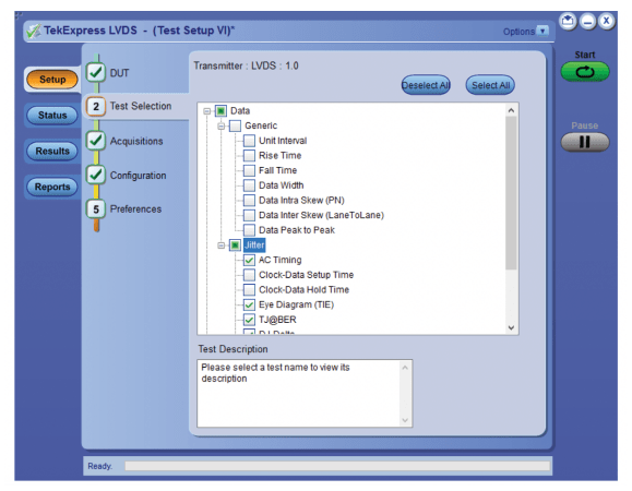 FIGURE 4. TekExpress automation software follows a logical flow from test setup to reporting. There are two groups of tests from which to choose: data and clock.
