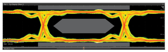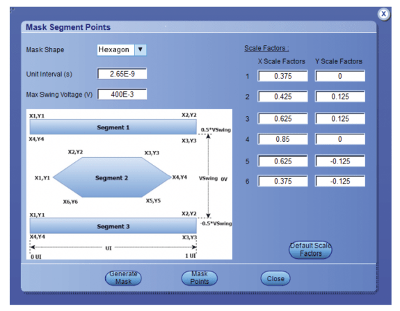 Automask generates a mask based on the signals’ maximum swing voltage, data rate and mask shape. The auto-generated mask can be further fine-tuned manually. The mask shape can be chosen from among hexagon, octagon and square shapes. Once generated, the mask is used with the eye diagram to check for violations and provide a pass/fail report.