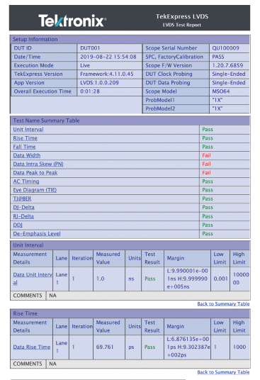After measurements have been completed, the automation software generates a test report. For each parameter it gives the associated lane number, measured value, pass/fail indication, and margin. Captured screen images may also be included. Results can be sorted by test name, lane number and result (pass/fail). Reports may be saved in PDF, mht and csv formats.