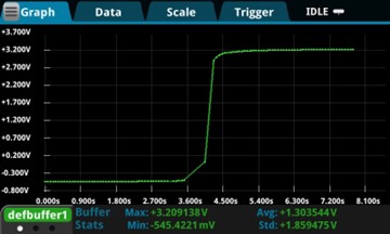 For the purposes of this application note, this test was run on an LED with a 20 mΩ resistance. The following image is a screenshot from the 2450 front panel after the script finished executing, showing the collected data in a graph.