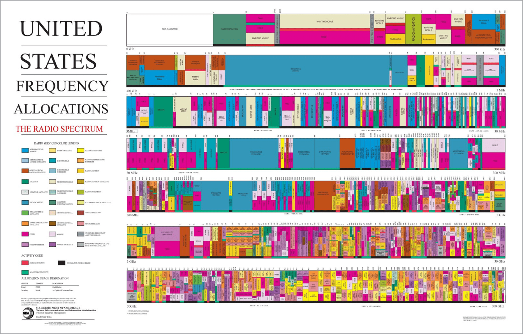 Figure 1. A frequency spectrum chart that shows the dense packing of RF and microwave allocations.