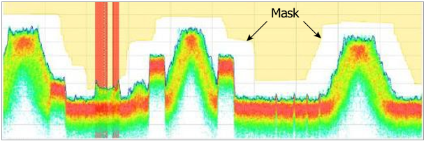 Frequency mask triggering, also known as frequency domain triggering, compares the spectrum shape on the display to a user-defined mask so that the instrument can trigger on changes in a spectrum shape. This ability makes it possible to trigger on weak signals in the presence of stronger ones, a useful feature when trying to detect random or intermittent signals in the presence of intermodulation products, transient signals, interference and suspect emitters. The mask is created by defining a set of frequency points in their amplitudes, point by point, either graphically or with a mouse. Points can even be automatically drawn based on user-defined amplitude and frequency offsets from a given spectrum trace. Triggers can be set to occur when a signal outside the mask enters within its bounds or when a signal inside the mask boundary exceeds it.