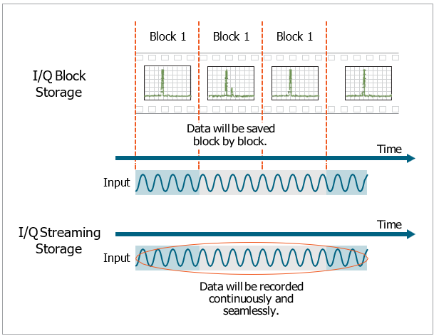I/Q streaming means the digital I/Q data will be streamed to disk for long-term seamless recording. Figure 11 describes the difference between I/Q block storage and I/Q streaming storage.