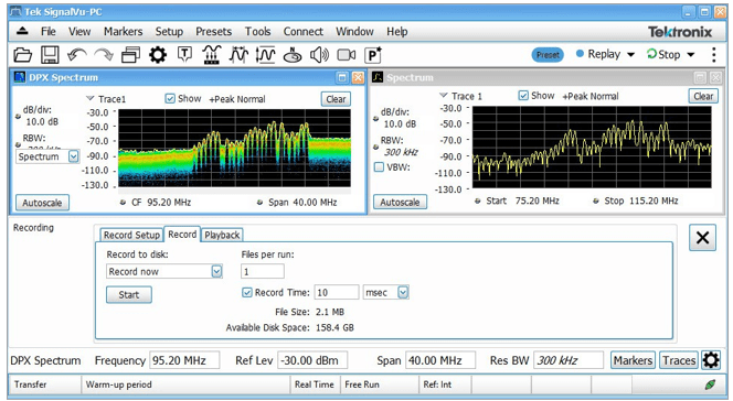 For the RSA300/500/600/7100 series, the devices can do the DPX analysis and recording process simultaneously. In Figure 13, the software analyzes the 92.3 MHz FM channel using DPX Spectrum with the signals from the FM channel recorded as I/Q data at once.