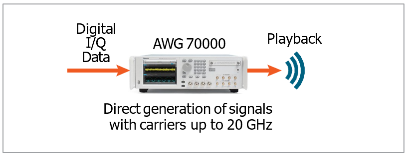 The AWG70000 Series can also be used for hardware playback. In Figure 16, the direct generation of wideband signals with carriers is up to 20 GHz, which can remove the need for external RF conversion.