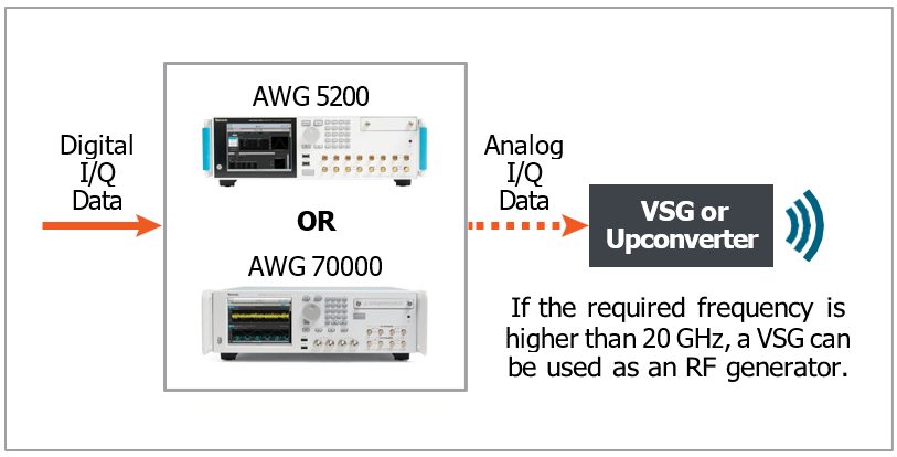Although a higher frequency of signals is required, AWG5200 or AWG71000 series can generate analog I/Q data of baseband and stream the signals to a VSG when the required frequency is higher than 20 GHz. If a higher DAC resolution is needed, choose AWG5200 (16-bit); if a wider I/Q baseband is needed, choose AWG70000.