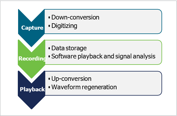 For field testing, the requirements to record real-world signal environments with high fidelity and replay the environment to test products in the lab are significant.Also, for spectrum management, rather than using spectrum analyzers with limited internal storage, recording and playback systems with large storage capacities can record a long-term signal for hours or days based on the requirements.