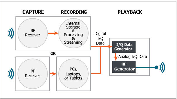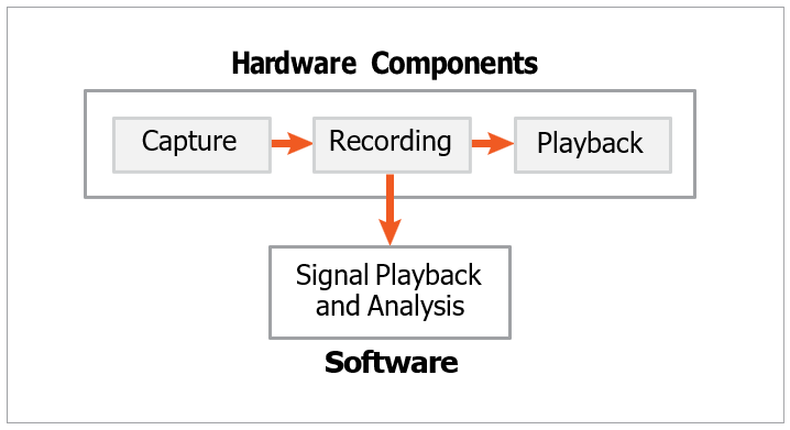Signal capture (top of Figure 2) forms the receiving front end and downconverter which transforms input signals into a digital sample stream. The data stream will be stored either internally or externally, depending on the capacity of capture storage and the length of the captured signal. Software can be used as software playback to analyze the stored data. For hardware playback, the recorder will convert the digital I/Q samples to analog I/Q data, and then streams the data to an external source for remodulation and retransmission.