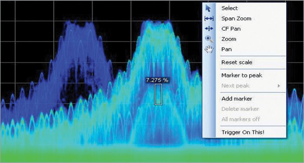 When a target signal appears, the density value increases. And as the trigger system monitors the density measurement, it activates a trigger whenever the density value exceeds the adjustable density threshold. The threshold need only be set to a level between the normal density readings and the density caused by the offending signal. The instrument software can also compute the threshold value automatically. If a wideband modulated signal such as a chirp is present and another signal of lesser amplitude is beneath it, both are seen because the latter signal occupies the frequency all the time and the chirp sweeps through it infrequently.
