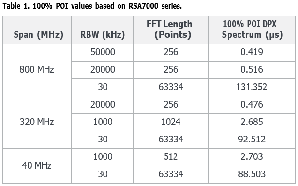 Three major factors determine the 100% POI value: Span, RBW and FFT length. Table 1 gives a brief example (based on the RSA7000 series) that shows how these factors affect POI specification.