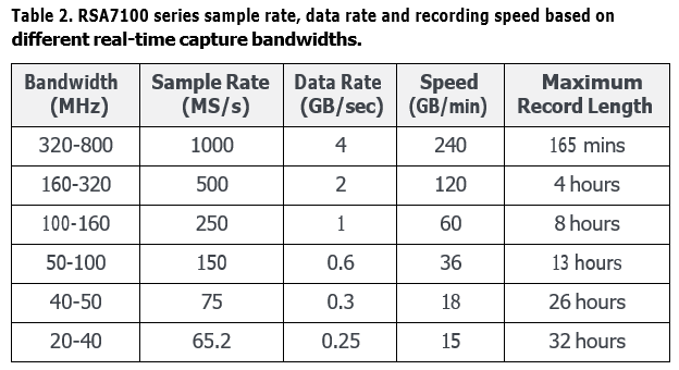 Table 2 presents the RSA7100 series sample rate, data rate and recording speed based on different real-time capture bandwidths.