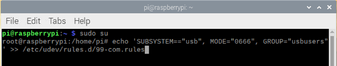 - echo 'SUBSYSTEM=="usb", MODE="0666", GROUP="usbusers"' >> /etc/udev/rules.d/99-com.rules • exit