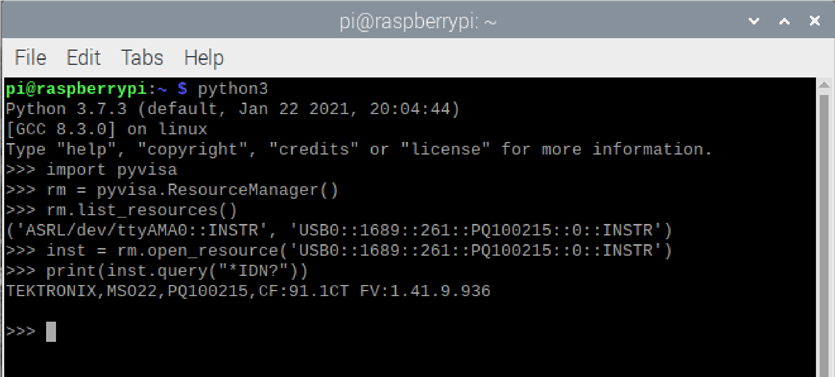To confirm the communication, enter an *IDN? query. If the return string lists the correct model number and serial number, then the Raspberry Pi is able to communicate with the oscilloscope. (See Figure 5 below.)