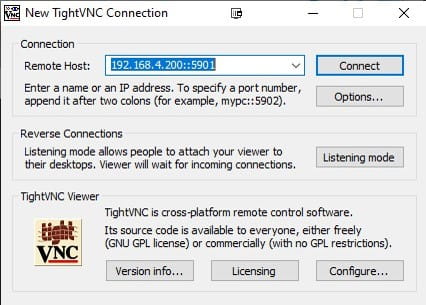 Once installed, start the TightVNC Viewer. In the connection window, enter the Raspberry Pi's IP address and the default port number (5901).