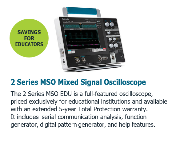 This bench provides students with practice on industry-leading instruments to help them learn real-world applications with the addition of our modern and affordable 2 Series MSO Mixed Signal Oscilloscope.