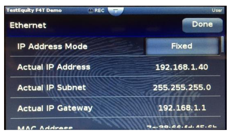 • In the Ethernet menu, touch the button in the IP Address Mode and choose the Fixed option.