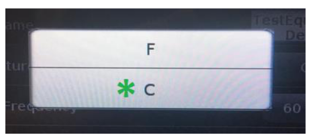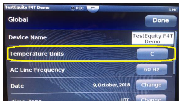 The F4T Touchscreen Controller is configured by TestEquity for both communication units and display units on the front panel to be in Celsius (°C). Other OEMs may integrate the F4T differently. Additionally, the controller may also be configured by the user to display units in degrees Fahrenheit (°F) via the front panel. Communication units and display units can be set independently.