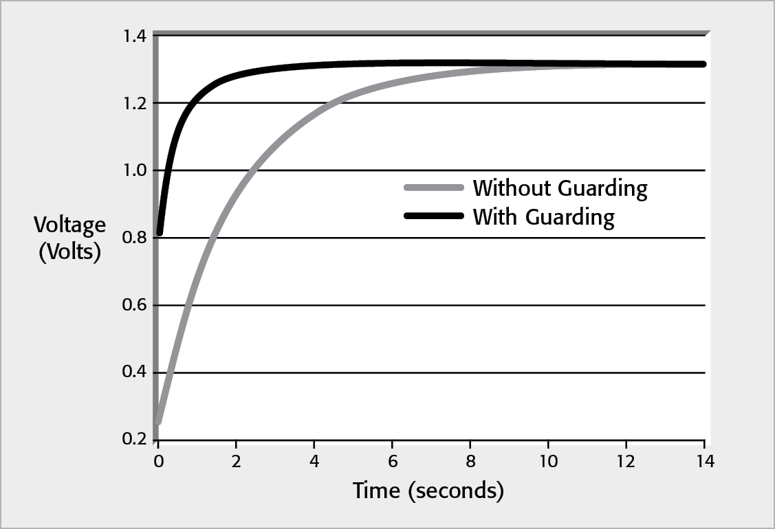 The theoretical limit of sensitivity in any measurement is determined by the noise generated by the resistances present in the circuit. As discussed in Sections 2.6.5 and 3.2.6, voltage noise is proportional to the square root of the resistance, bandwidth, and absolute temperature. Figure 1-2 shows theoretical voltage measurement limits at room temperature (300K) with a response time of 0.1 second to ten seconds. Note that high source resistance limits the theoretical sensitivity of the voltage measurement. Although it’s certainly possible to measure a 1µV signal that has a 1Ω source resistance, it’s not possible to measure that same 1µV signal level from a 1TΩ source. Even with a much lower 1MΩ source resistance, a 1µV measurement is near theoretical limits, so it would be very difficult to make using an ordinary DMM.