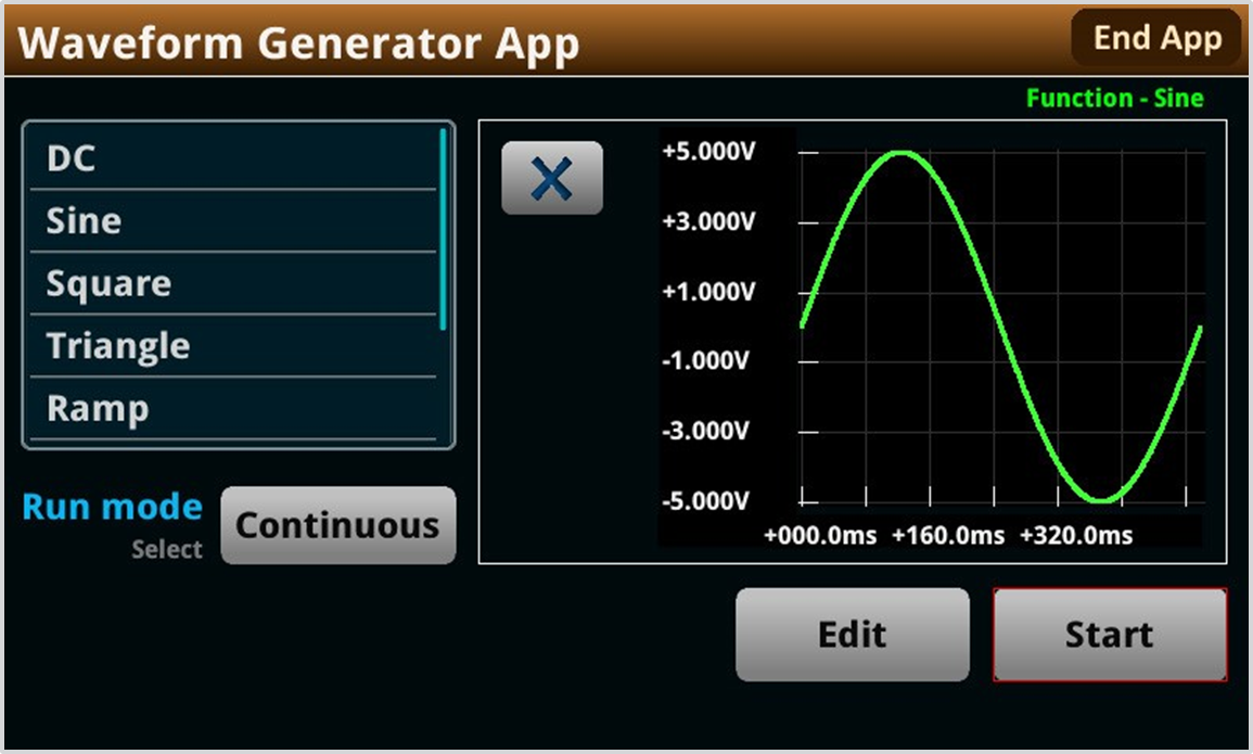 Navigate through the list to find your desired waveform. Tap the option to open a menu with specific settings for the selected waveform. Here, you may select between voltage and current sourcing, triggering options, and waveform characteristics. Figure 7 shows settings used for a 5 V sine wave with a frequency of 2 Hz.
