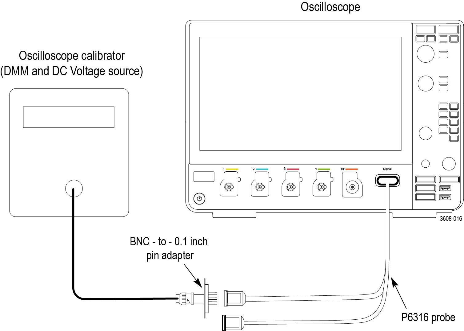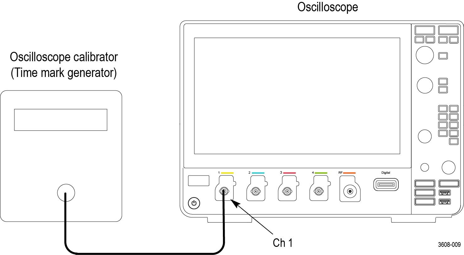Connect the output of the leveled sine wave generator (for example, Fluke 9500) to the oscilloscope channel 1 input as shown below.