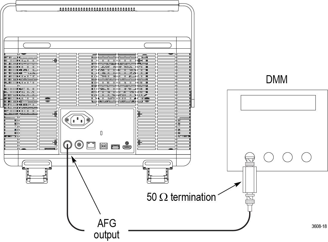 Connect the AFG output to the DMM through a 50 Ω termination.