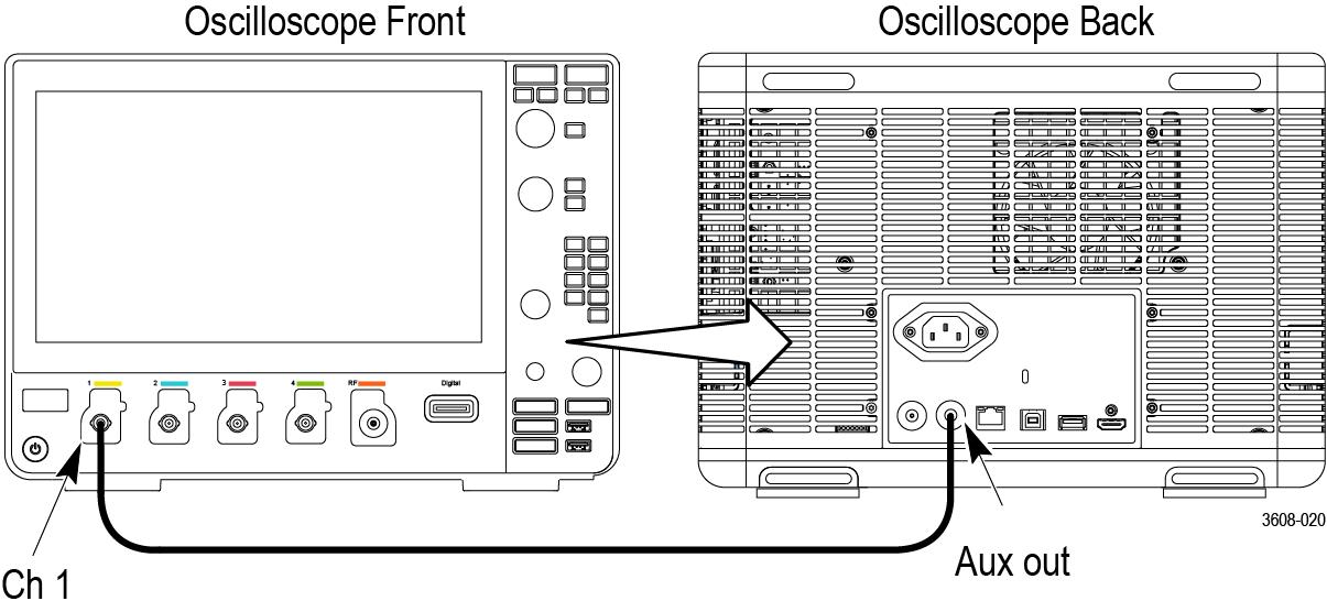 Connect the Aux Out signal from the rear of the instrument to the channel 1 input using a 50 Ω cable.
