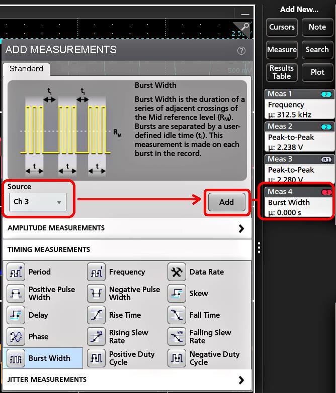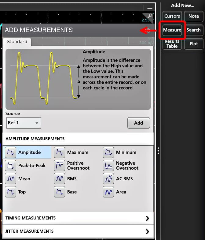 Note:Waveforms do not need to be displayed to be used for measurements, as long as the channel or waveform badge is on the Settings bar and is acquiring the signal to measure. - Tap the Add New...Measure button to open the Add Measurements configuration menu or drag the Measure button onto a waveform in the waveform display area to automatically set the source.