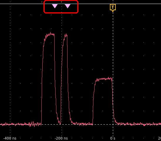 Note:You cannot search for sequential events (there is no Sequence search type). - The searched waveform is marked with one or more triangles as soon as the search criteria becomes true. Each search uses a different color for its markers. The example image shows search criteria set to find positive pulse widths that are less than 70 ns wide.