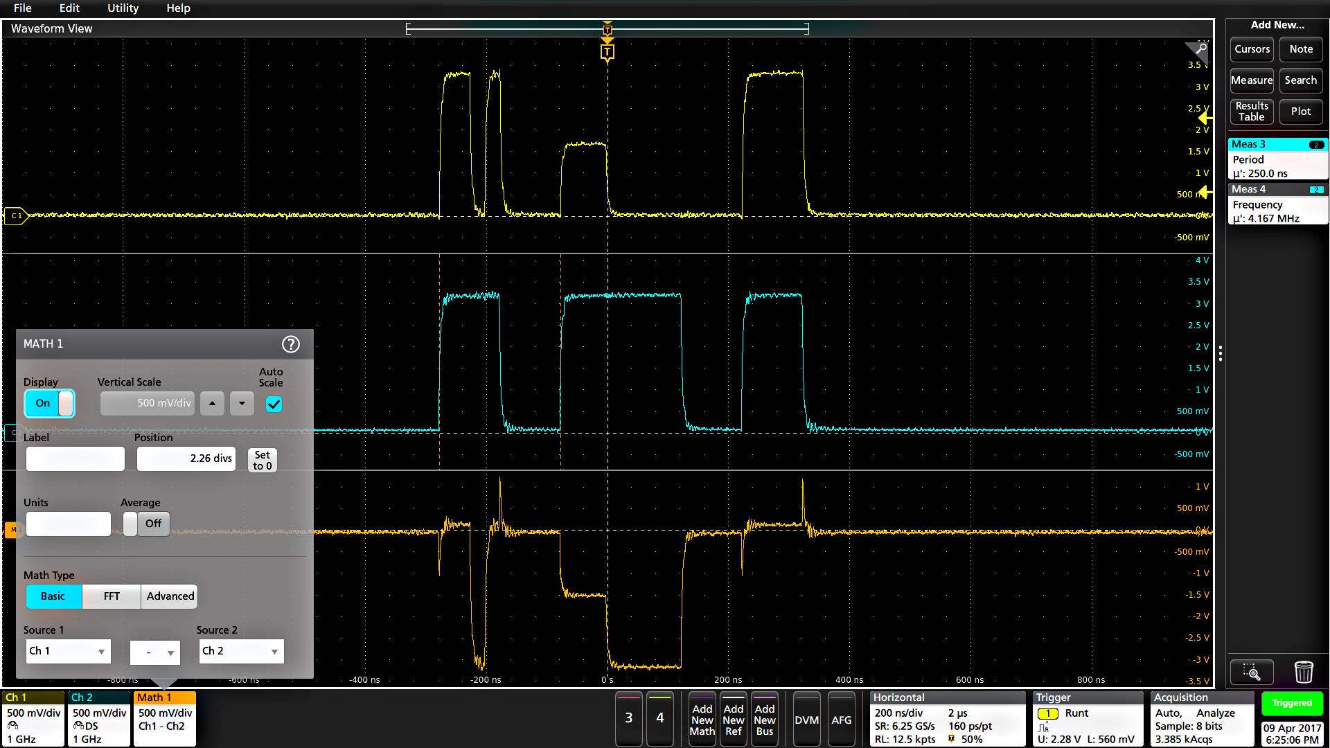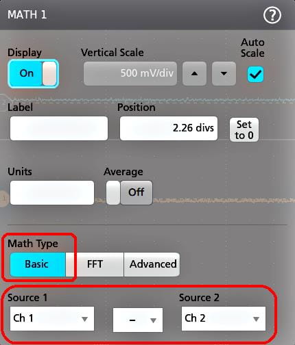 This example shows adding a Math waveform, using the Math Source fields to select Ch 1 and Ch 2 as the waveform sources, set the math type to Basic math operation, and subtracting channel 2 from channel 1.