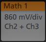 - The instrument adds the waveform to the Waveform view, adds a Waveform badge to the Settings bar, and opens a configuration menu. This example shows adding a Math waveform.
