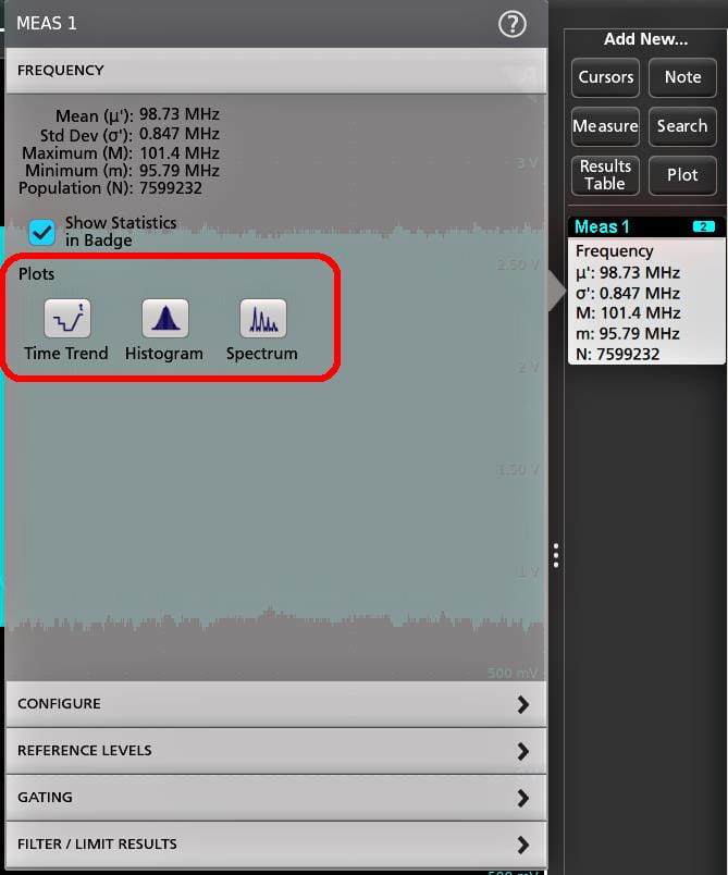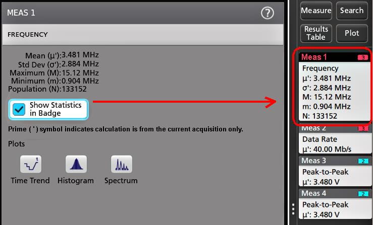 Use this procedure to add statistical readouts to the measurement badge, display plots for the measurement, and refine measurement parameters (configuration, global versus local scope of settings, gating, filtering, and so on).