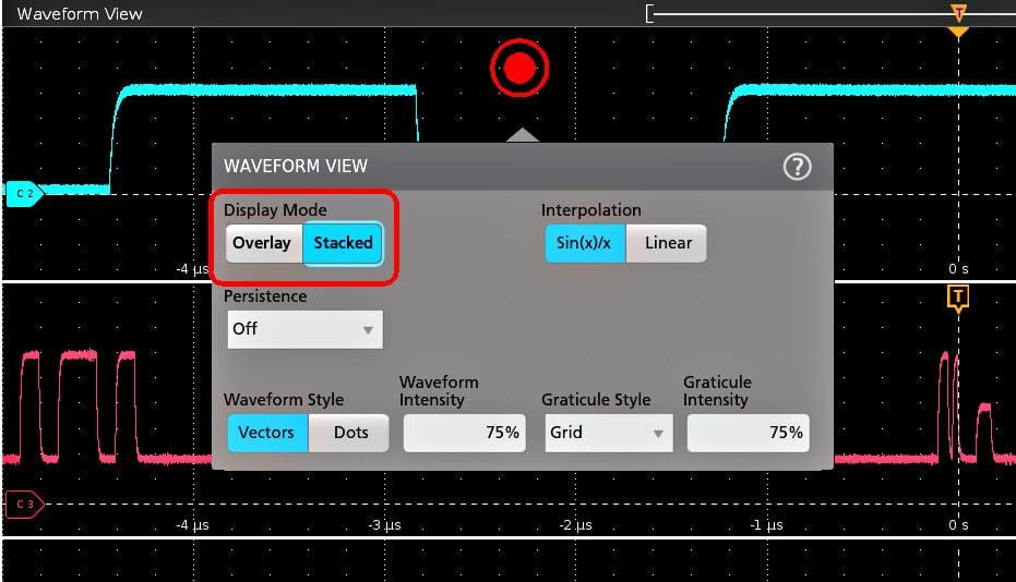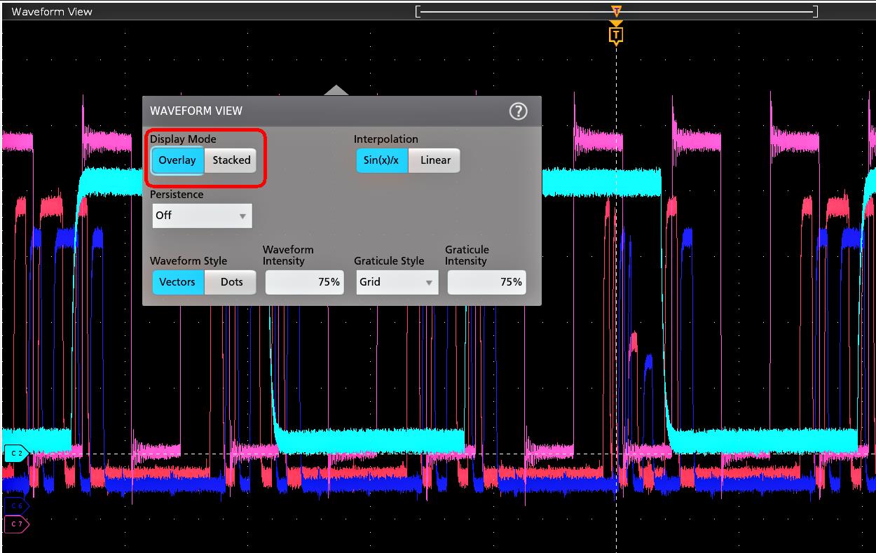 Use this procedure to change the waveform display mode (Stacked or Overlay), waveform trace interpolation algorithm, waveform persistence, style and intensity, and graticule style and intensity.