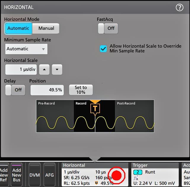 Use this procedure to set the horizontal time base parameters such as mode, minimum sample rate, horizontal scale, delay, and trigger delay time (relative to the center of the waveform record.