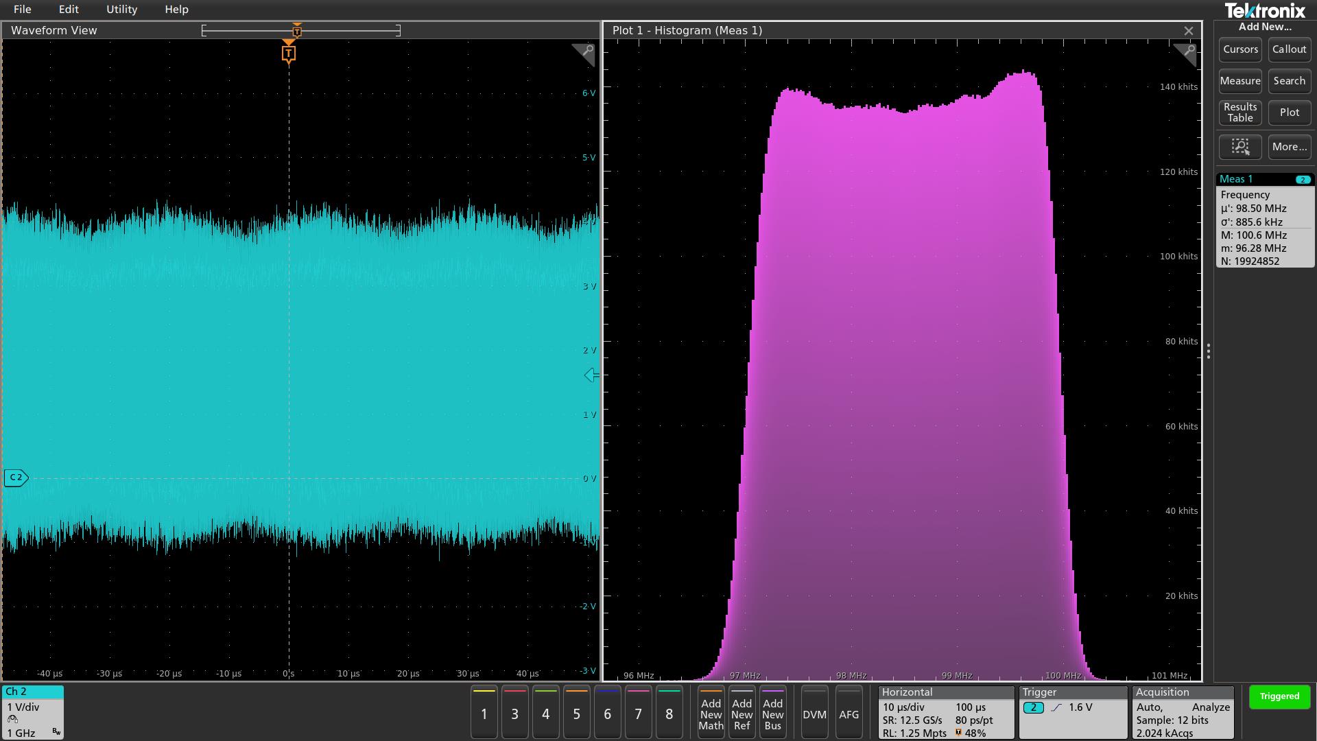 Measurement plots let you graph the distribution of waveform data point occurrences (histogram), plot the frequency components (spectrum) of a waveform, show the time trend of a measurement, display an eye diagram, and other supported plots. Available plots depend on the measurement.