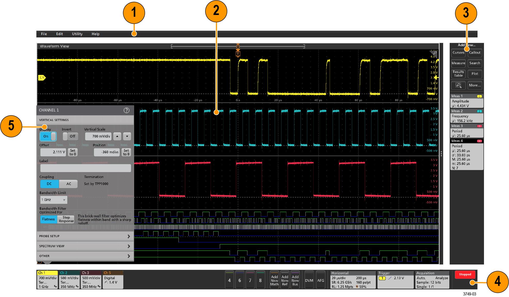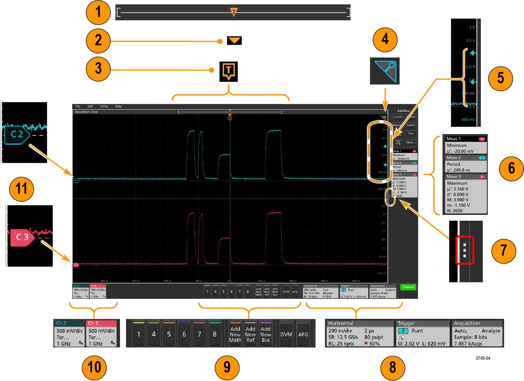 Math waveforms let you create new waveforms based on operations between two or more waveforms or by applying equations to waveform data. A reference waveform is a static waveform record displayed for comparison. Bus waveforms let you view and analyze serial or parallel data.