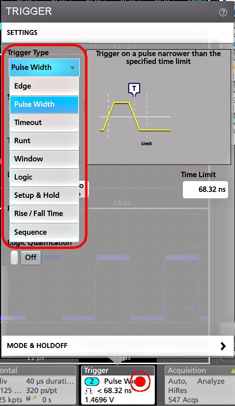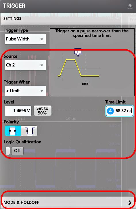 Note:Triggering on buses other than Parallel requires purchasing and installing serial trigger and analysis options. - Select the other fields and panels to refine the trigger conditions. The menu fields and trigger graphic updates as you make changes to the trigger settings. Displayed fields depend on the selected trigger type. Selection changes take effect immediately.