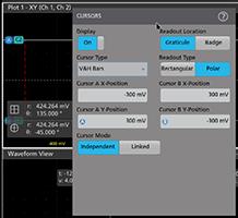 Cursors are on-screen lines that you can move to take measurements on specific parts of a waveform or plot, or between two different waveforms. Cursor readouts show both current position values and the difference (delta) between cursors. Polar cursor readouts are available through the cursor configuration menu for XY and XYZ plots.