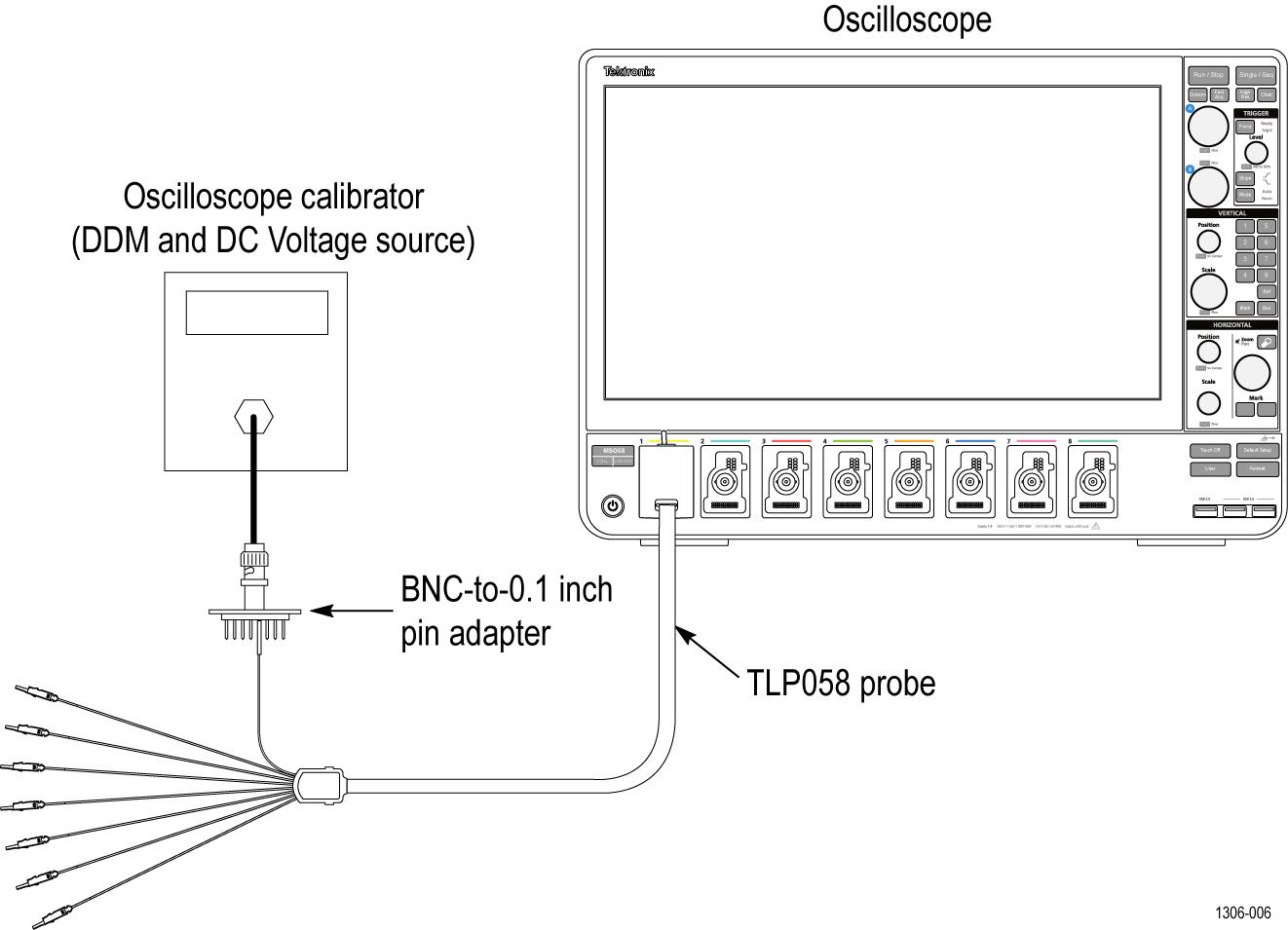 WARNING:Set the generator output to Off or 0 volts before connecting, disconnecting, or moving the test hookup during the performance of this procedure. The generator is capable of providing dangerous voltages.If you are using the Fluke 9500 calibrator as the DC voltage source, connect the calibrator head to the digital channel D0, using the BNC-to-0.1 inch pin adapter listed in the Required equipment table. Be sure to connect channel D0 to both the corresponding signal pin and to a ground pin on the adapter.