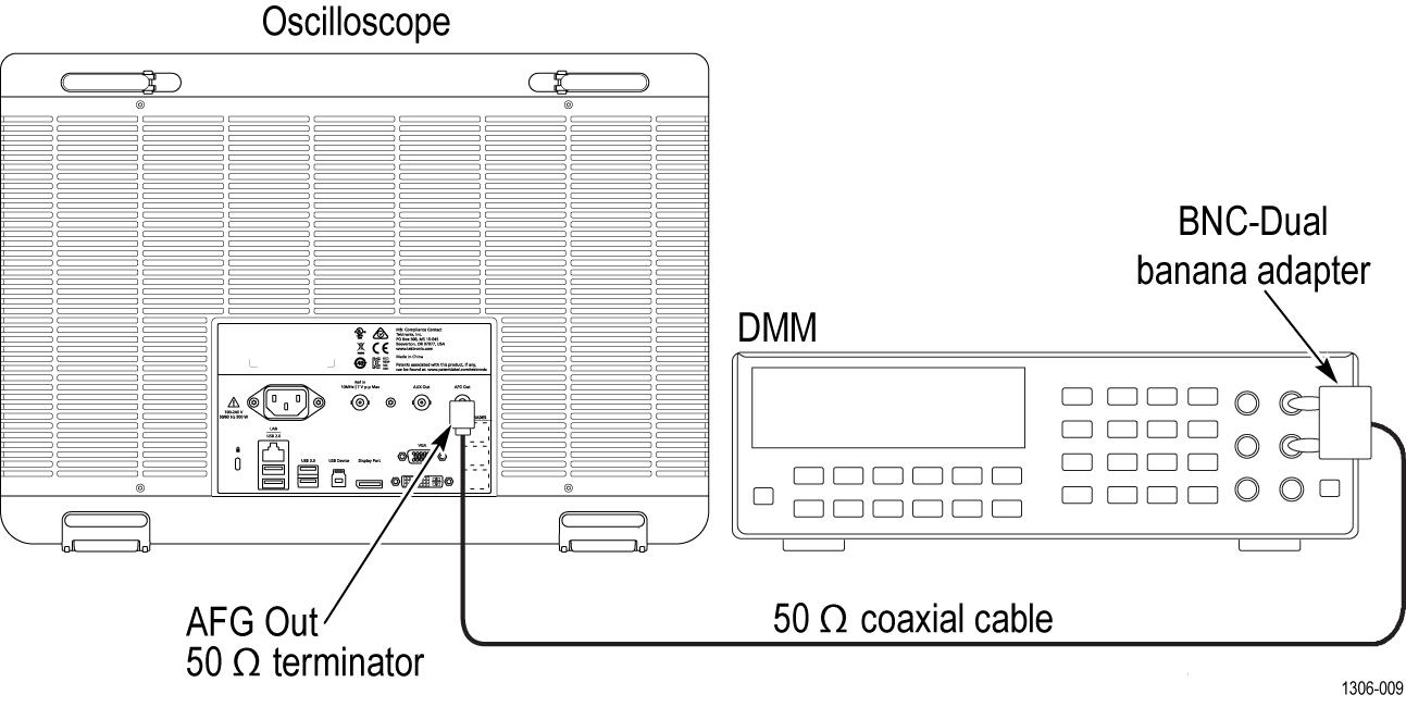 - Connect the arbitrary function generator output to the DMM as shown in the following figure. Be sure to connect the 50 Ω terminator to the arbitrary function generator AFG Output connector.