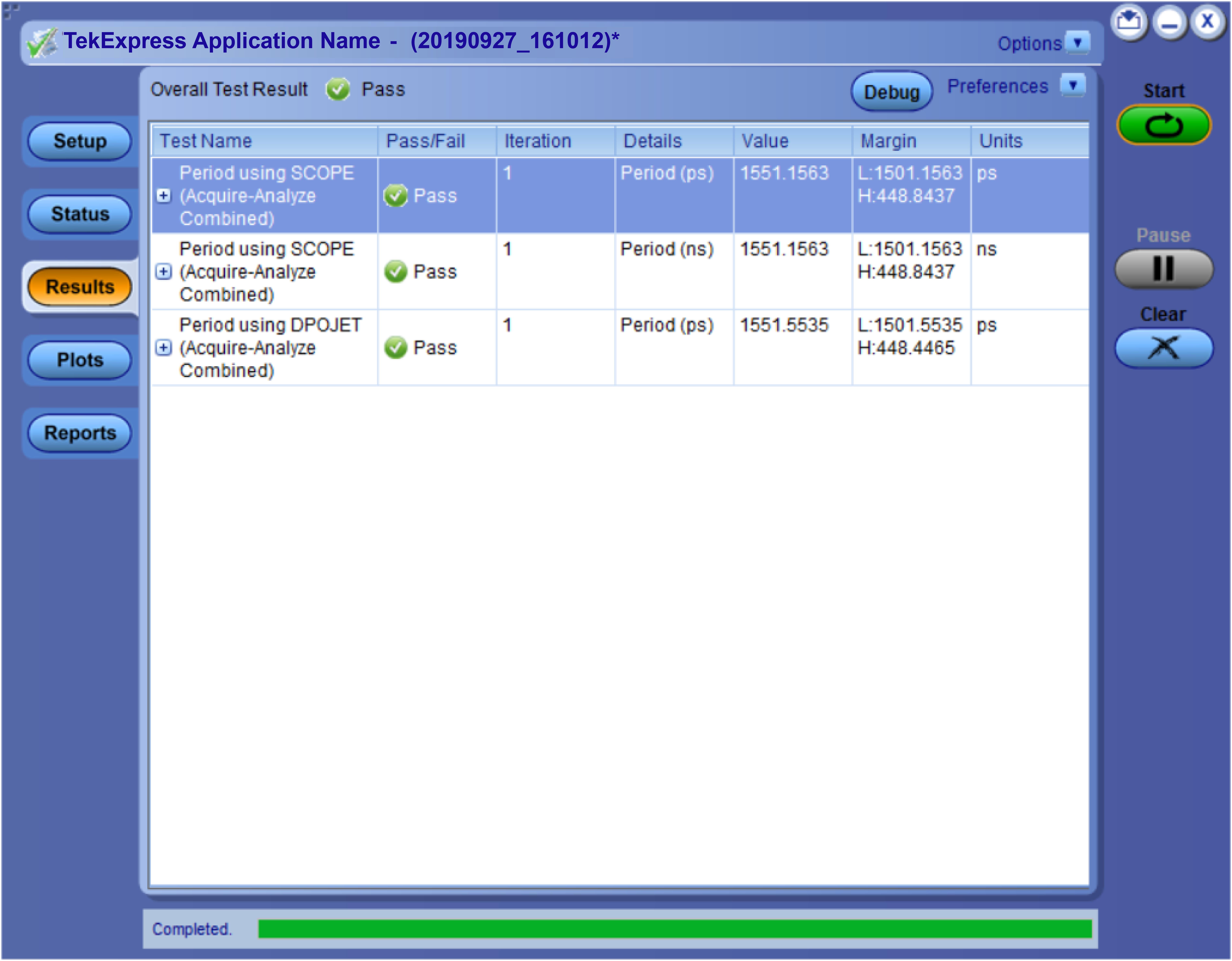 TEKEXP:RESULT? "Period using SCOPE (Acquire-Analyze Combined)"\n | It returns Pass when the test result is Pass. |
